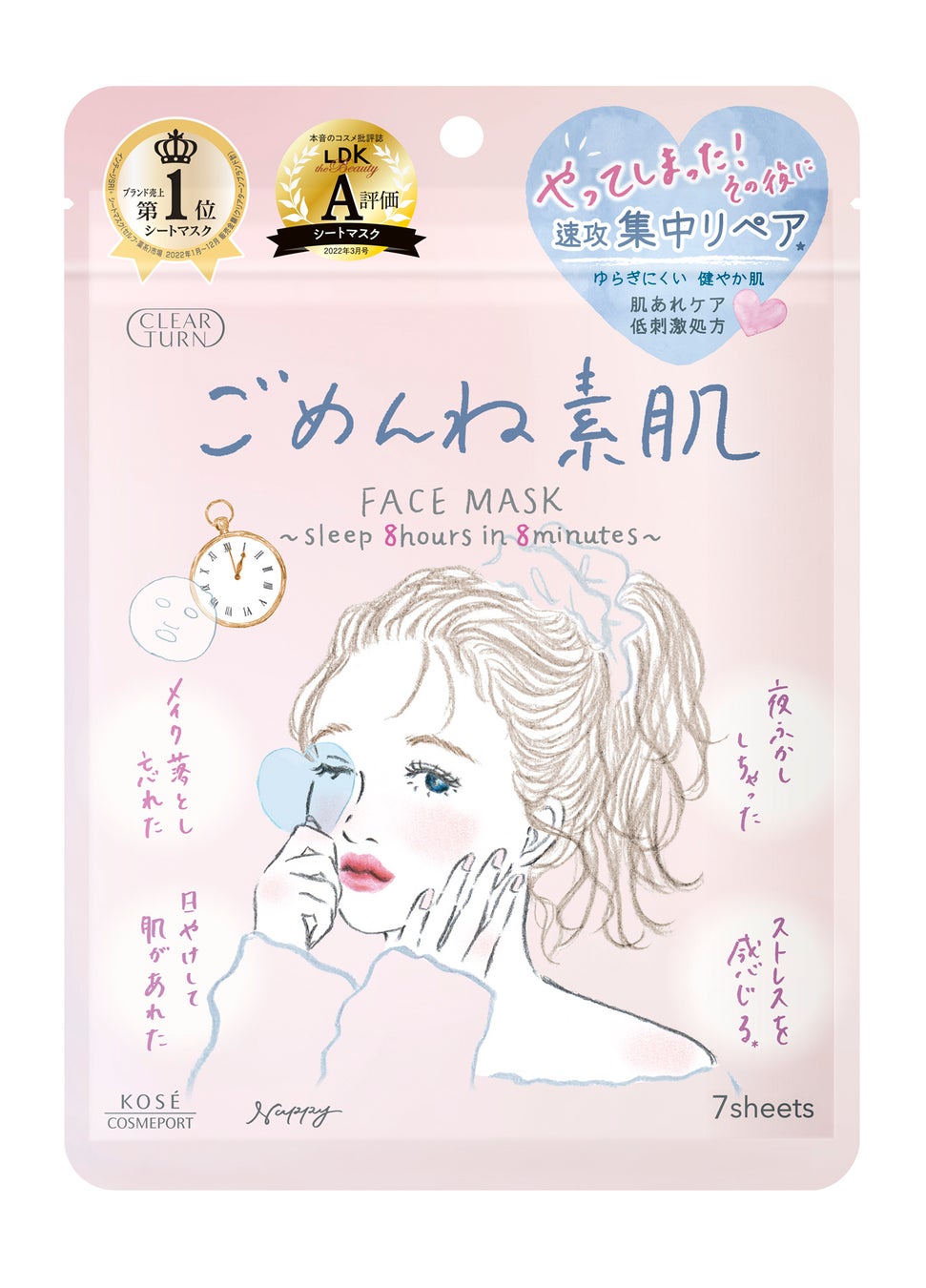 『クリアターン』「ごめんね素肌マスク」は、忙しい毎日を過ごしながらも、キレイを叶えたい方々に向け、“8分の集中ケアで8時間熟睡したような肌に”をコンセプトとするシートマスクです。忙しい生活の中で、肌に負担をかけ、あれてしまった肌の素肌環境※1をととのえる、スキンケアの“お守りアイテム”として幅広い方から支持を得ています。