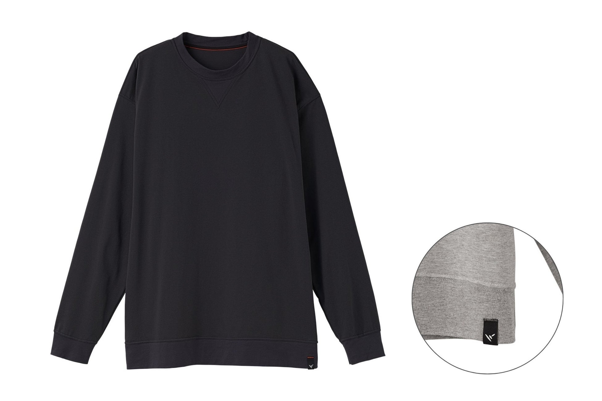 首元にガゼットを施した、ラフすぎない長袖のトップス。汗止めやちぢみ防止の役割も果たしてくれるので、ヨレがきになりにくいです。裾には、黒地にベネクスのブランドマークがデザインされた新ネームテープがついています。