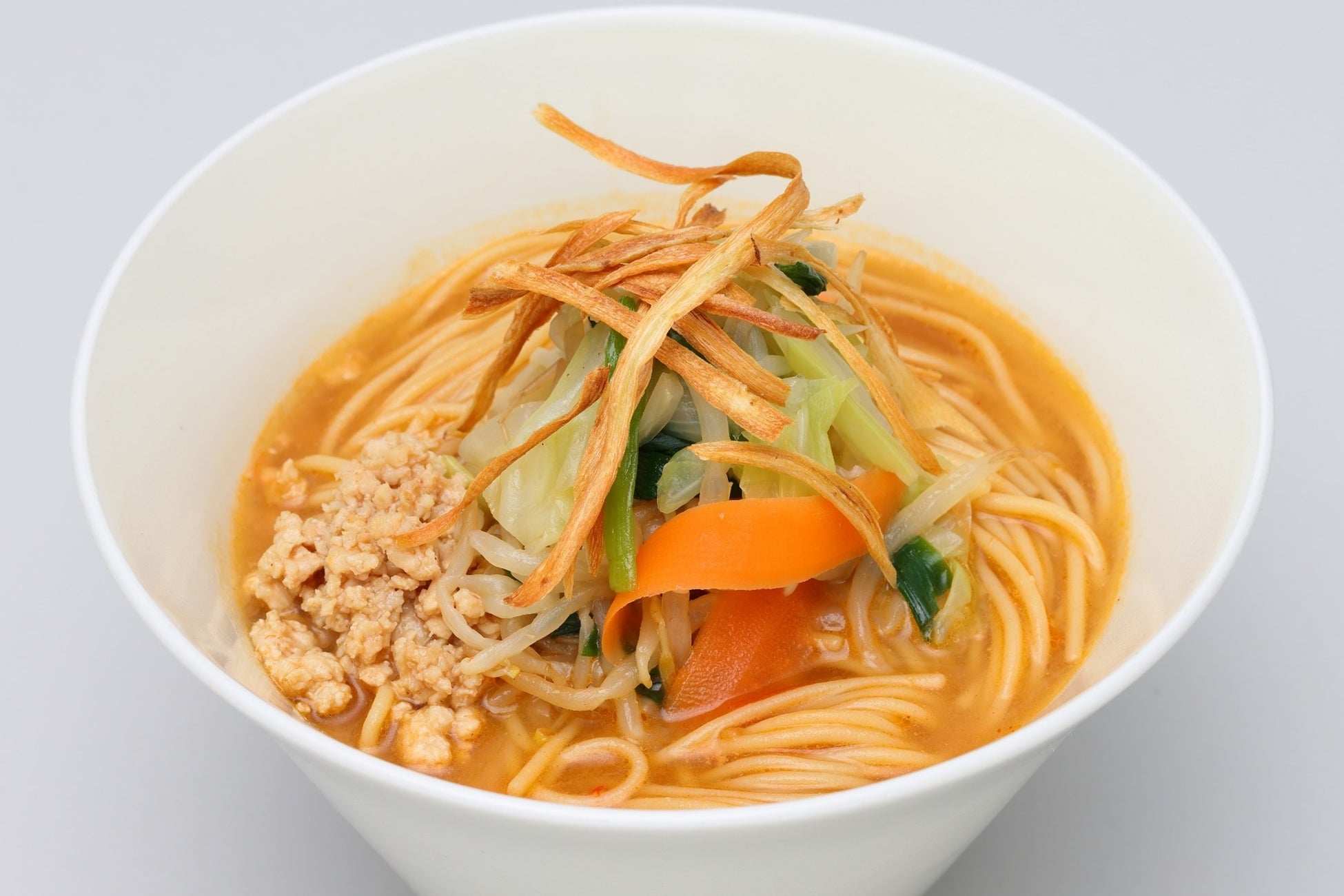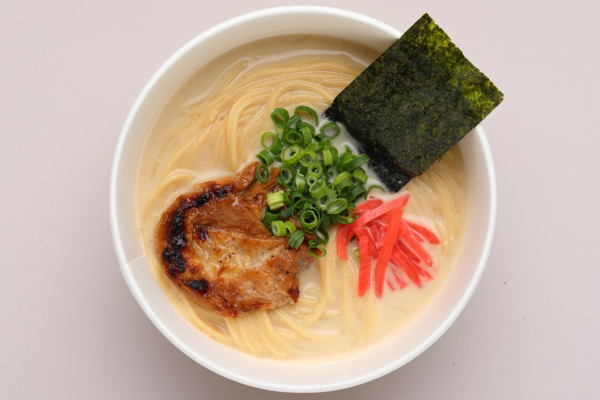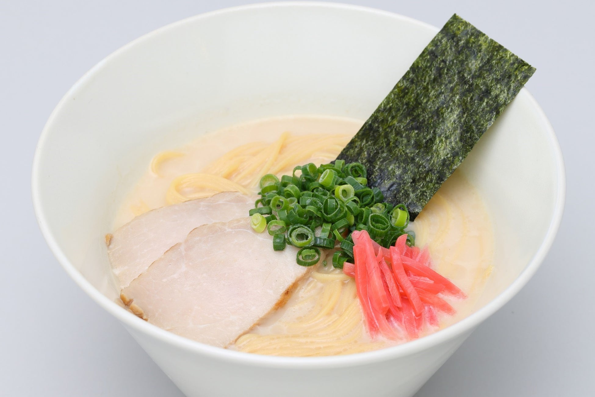 屋台の定番、香りにつられて夜に食べたくなるラーメンです。豚モモ肉のチャーシュー、のり、青ネギ、紅ショウガなどの王道トッピングに、野菜出汁と豆乳のとんこつ風ラーメンスープを合わせています。野菜のうまみを活かしたヘルシーで低カロリーな一杯です。