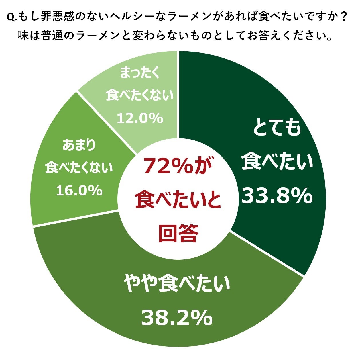 さらに、ZENBが実施した「食生活に関する調査」によると、「もし罪悪感のないヘルシーなラーメンがあれば食べたいですか」という問いに対し、72%の人が「食べたい」と回答。このような背景から、罪悪感なく、おいしく、カラダにもやさしく楽しめる低カロリーな「罪なきラーメン」を開発するに至りました。