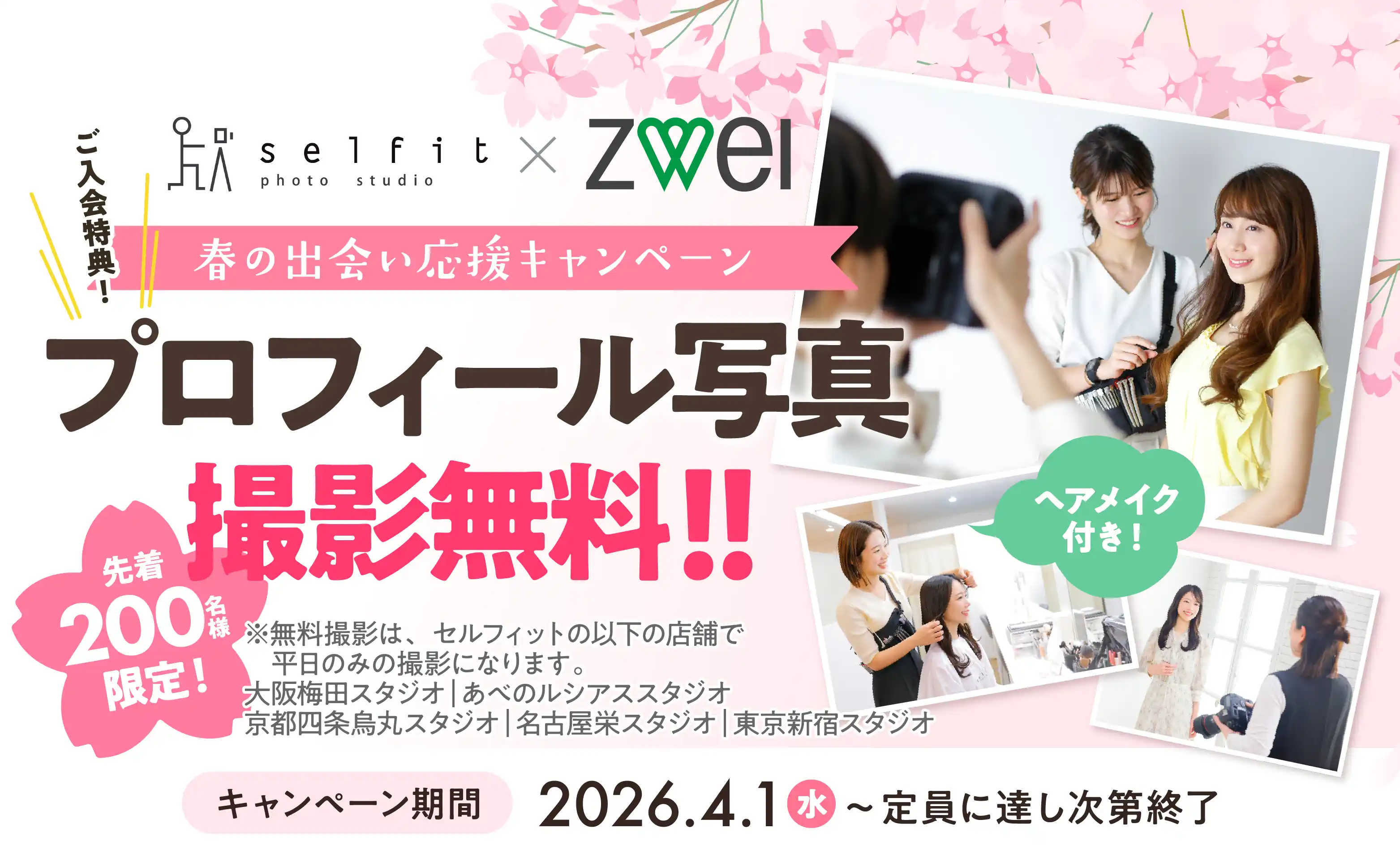 業界最多・全国54店舗のネットワークを持つ大手結婚相談所の株式会社ZWEI(ツヴァイ)(本社:東京都中央区、代表取締役社長:橋爪 みずほ、以下「ZWEI」)は、2026年4月1日(水)より、株式会社セルフィットが運営する総合写真館「スタジオセルフィット」(本社:大阪府大阪市、以下「セルフィット」)と連携し、新規入会者を対象とした「春の出会い応援キャンペーン」を開催します。キャンペーン期間中にZWEIに入会された先着200名限定で、ご入会特典としてセルフィットでのプロフィール写真撮影(通常18,000円相当)を無料でプレゼントします。