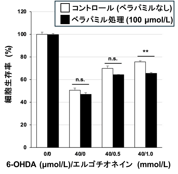 不死化視床下部神経細胞をベラパミル(100 μmol/L)で前処理した。培地交換後、細胞をエルゴチオネイン(0.5または1.0 mmol/L)で前処理し、6-OHDA(40 μmol/L)の非存在下(コントロール)または存在下で24時間インキュベートした。細胞生存率(%)データを平均値±標準誤差で表す(n = 4)。n.s.; 有意ではない。** ; Dunnett検定でp値 < 0.01 (コントロール対ベラパミル(100 μmol/L))。