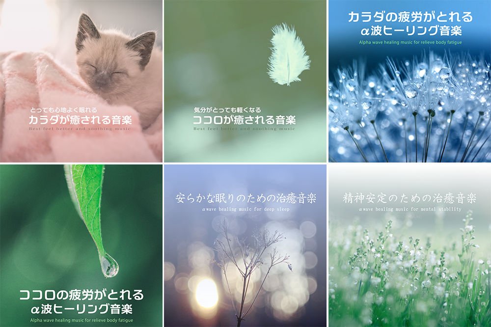 『とっても心地よく眠れる〜カラダが癒される音楽〜』、『気分がとっても軽くなる〜ココロが癒される音楽』、『カラダの疲労がとれるα波ヒーリング音楽』、『ココロの疲労がとれるα波ヒーリング音楽』、『安らかな眠りのための治癒音楽』、『精神安定のための治癒音楽』と題された6作品は、眠りや心、体、精神の安定など各作品テーマを持ち、様々な角度からメンタルヘルスのケアをする癒しのヒーリング作品です。
