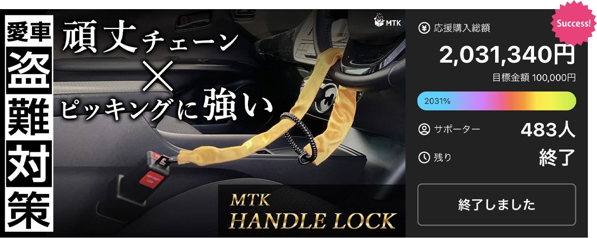 【10/6よりプロジェクト開始!】待望の新モデル「MTK ハンドルロック2」Makuakeに登場 ― 2031%達成の防犯ギアがさらなる進化を遂げて帰ってきた!