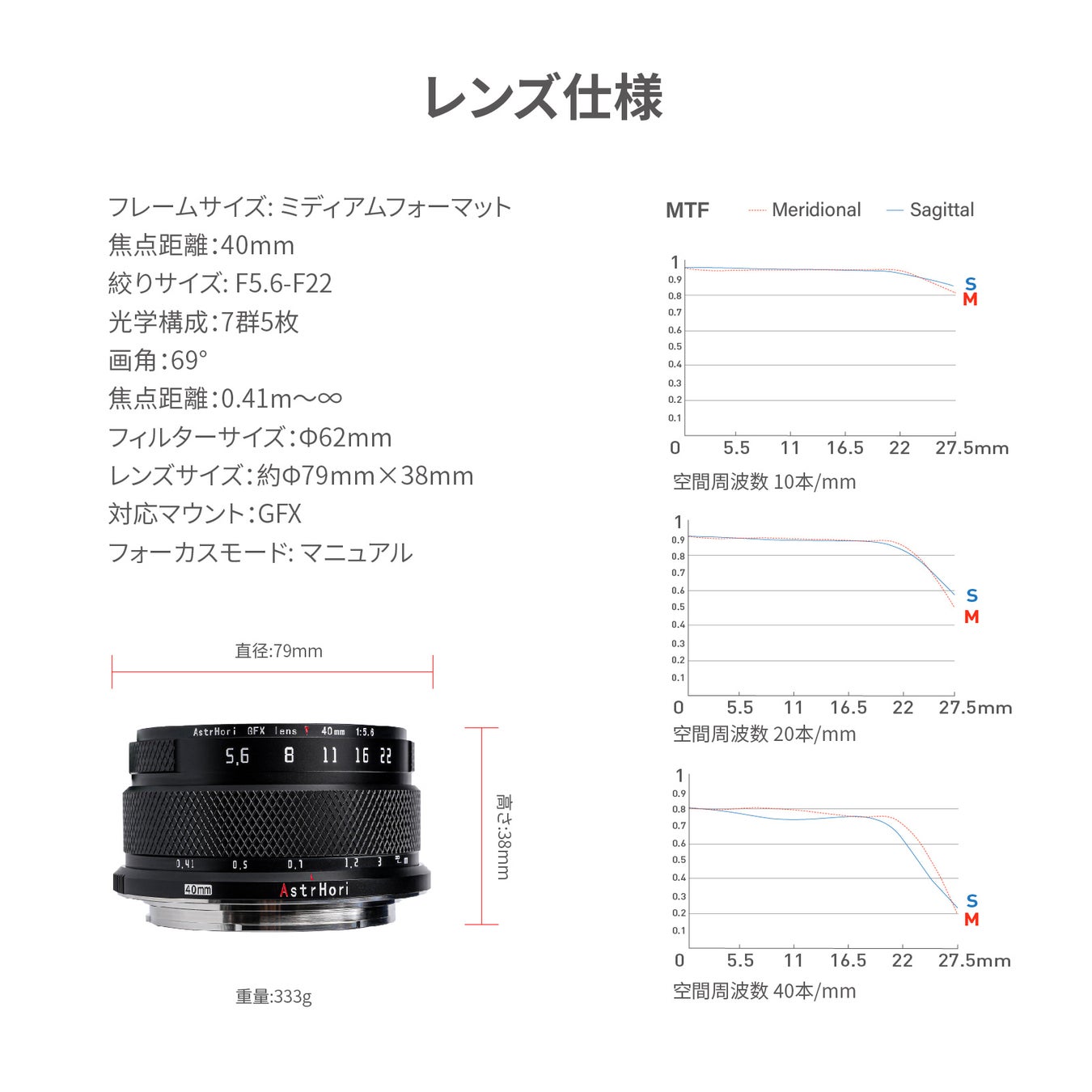 AstrHoriから40mm F5.6を発売しました。Fuji GFXカメラ用のマニュアルレンズで、Fuji GFX、GFX 50S、GFX 50SII、GFX 50R、GFX 100、GFX 100S、GFX 100 IR Verに対応します。今メーカー希望小売価格は43,999円です。中華撮影機材を取り扱っているPergearにて、販売開始しました。