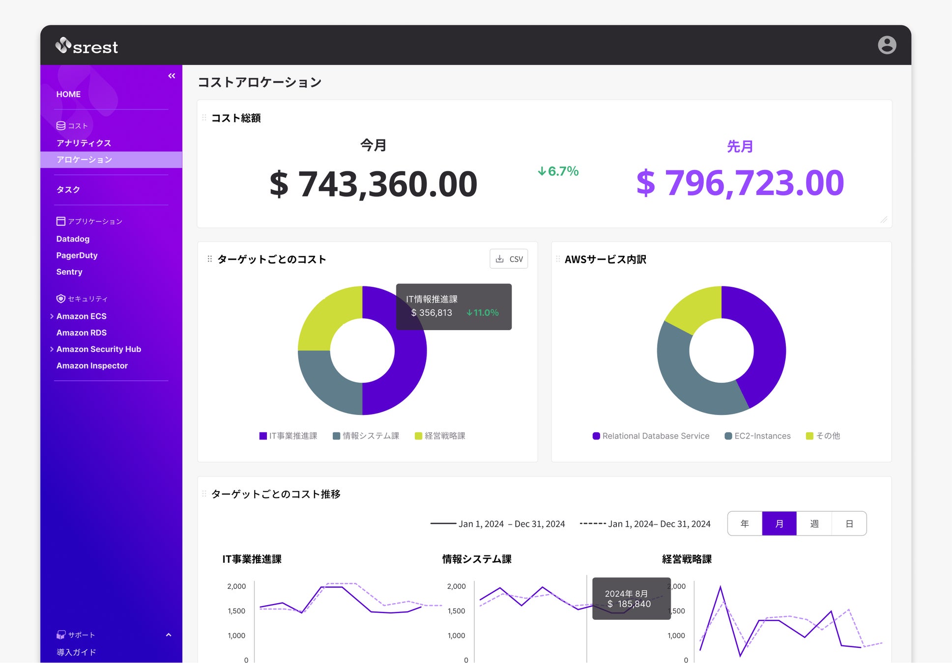 AWSコスト管理ツール「srest(スレスト)」は、複数のAWSアカウントのコストデータを様々な角度から可視化して、企業のクラウドコスト管理を容易にします。ダッシュボードは詳細なコスト分析を行うことができ、AWSコストの最適化を支援します。SREエンジニアの業務を少しでも効率化したいという思いから、SRE+rest(休息)で「srest」と名付けました。AWSが実施する技術レビュー「AWS Foundational Technical Review」を通過し、AWS 認定ソフトウェアにもなっています。