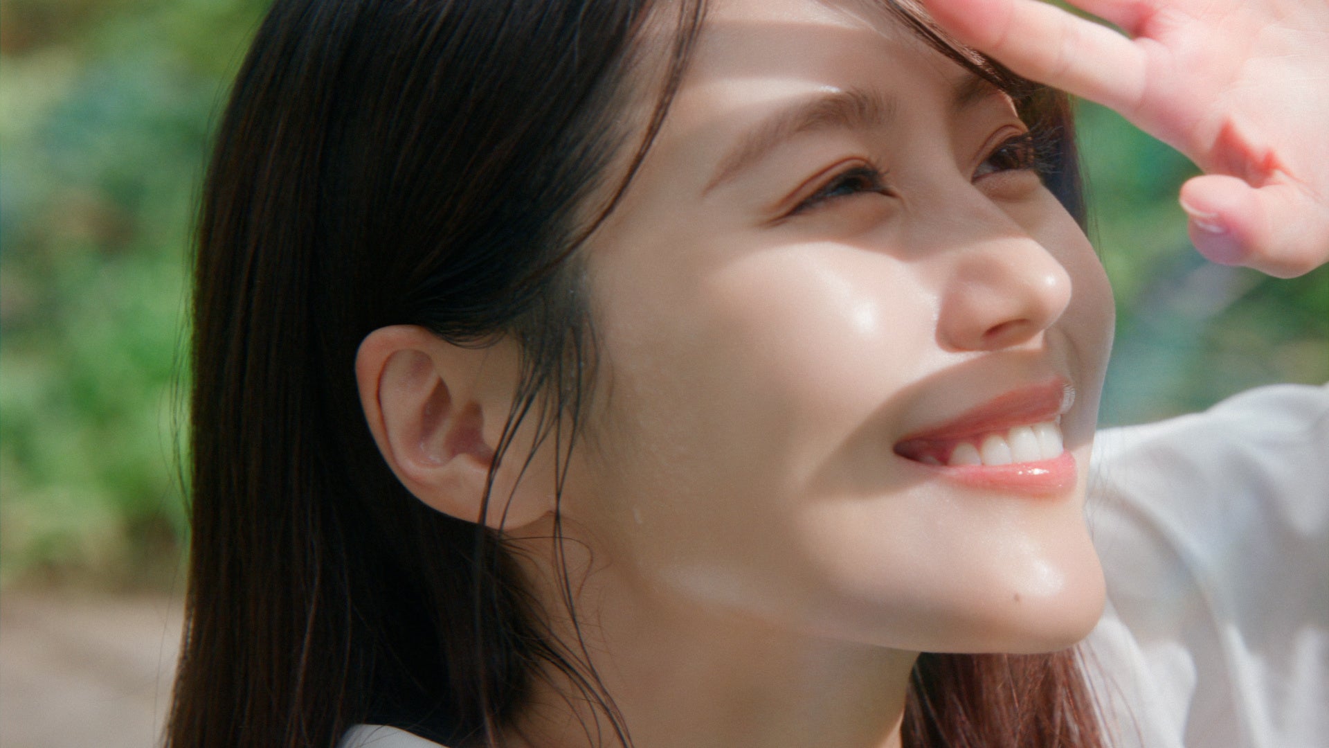 緑あふれる穏やかな場所で、日差しを浴びて、生き生きとした表情の有村さん。「スキンプロテクトベース 皮脂くずれ防止 UV50 EX」をつけているおかげで、汗や皮脂によるくずれからも、午後の乾燥感からも守ってくれると微笑みます。