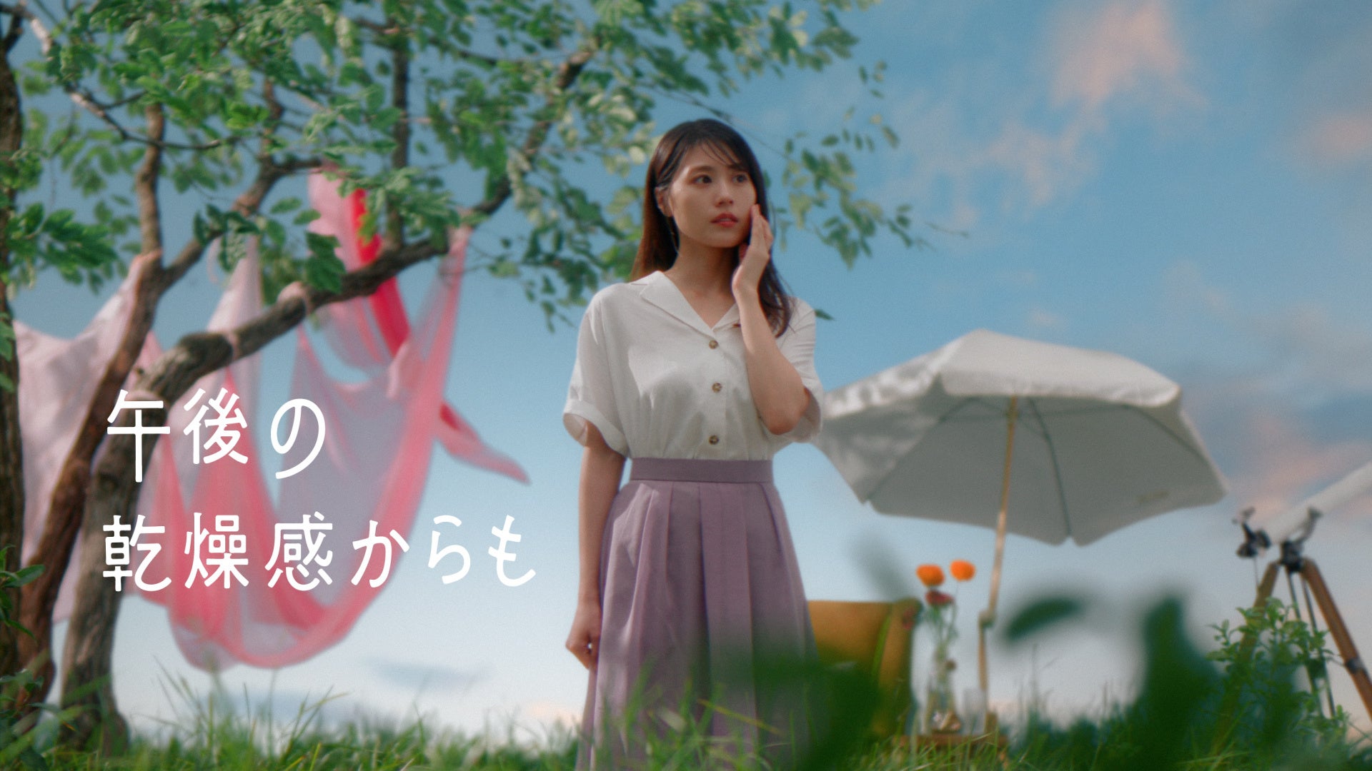 今回はご覧の通り、草原に囲まれて撮影を進めておりました。すごく爽やかな風を浴びながらリラックスした表情で撮影できたかなと思っています。暑くてメイクがくずれそうになる場面でも、乾燥してしまう場面でも守ってくれる下地というところを、CMを見てくださった方が感じられるようなムービーになっていると思います。