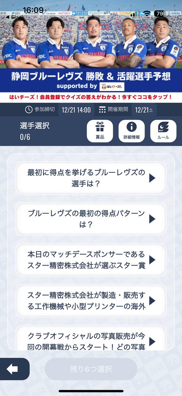 上記に加えて協賛の『はいチーズ!』やマッチデースポンサーである『スター精密株式会社』にまつわるクイズがあります。