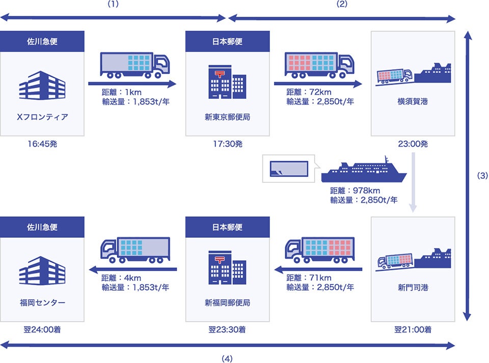 (4) 新門司港に到着後、日本郵便・新福岡郵便局(福岡県福岡市)に立ち寄り、郵便物などを荷降ろし、その後、佐川急便・福岡センター(福岡県粕屋郡粕屋町)へ輸送、宅配便荷物の荷降ろしを行う。