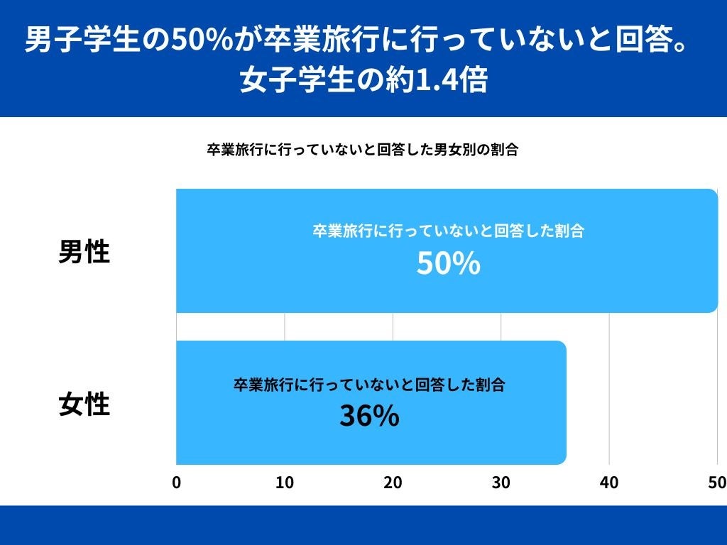 【男子学生の50%が卒業旅行に行っていないと回答。女子学生の約1.4倍】