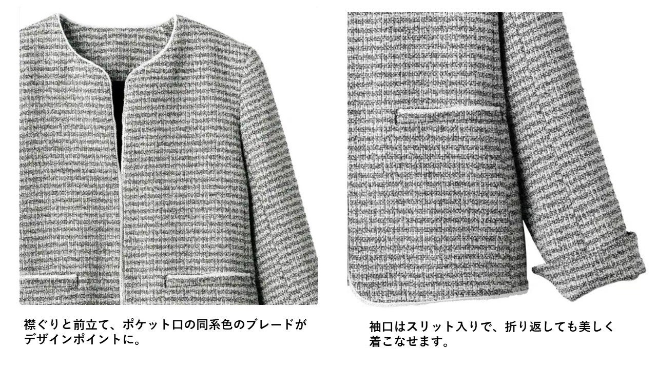 襟ぐりと前立て、ポケット口には同色系のブレードを施し、デザインポイントにしています。袖口にはスリットが入っているので、折り返してもシルエットは美しいまま!