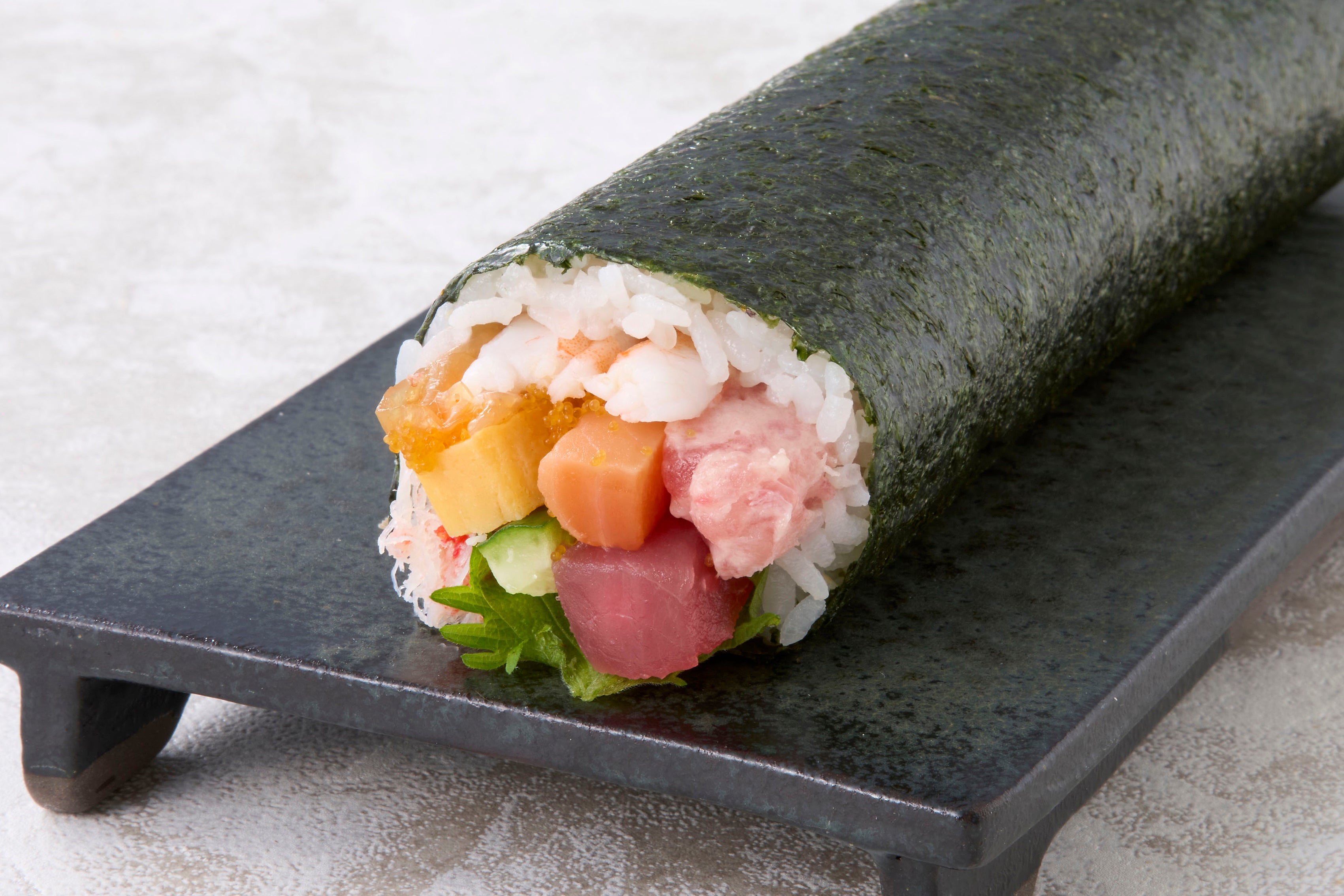 ◯商品説明:まぐろ・サーモン・カニ・海老など7種類の海鮮を贅沢に巻いた太巻です。