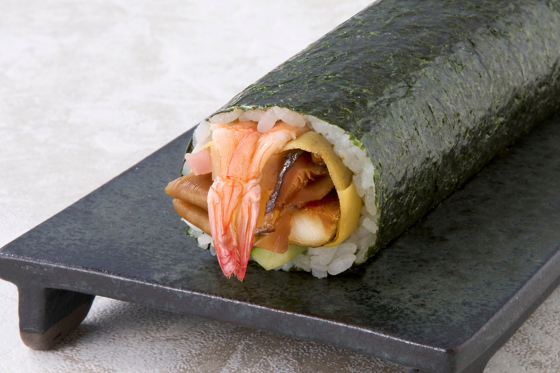 ◯商品説明:海老・穴子など12種類もの具材を巻いた、一口ごとに違う味がお楽しみいただける極太巻です。