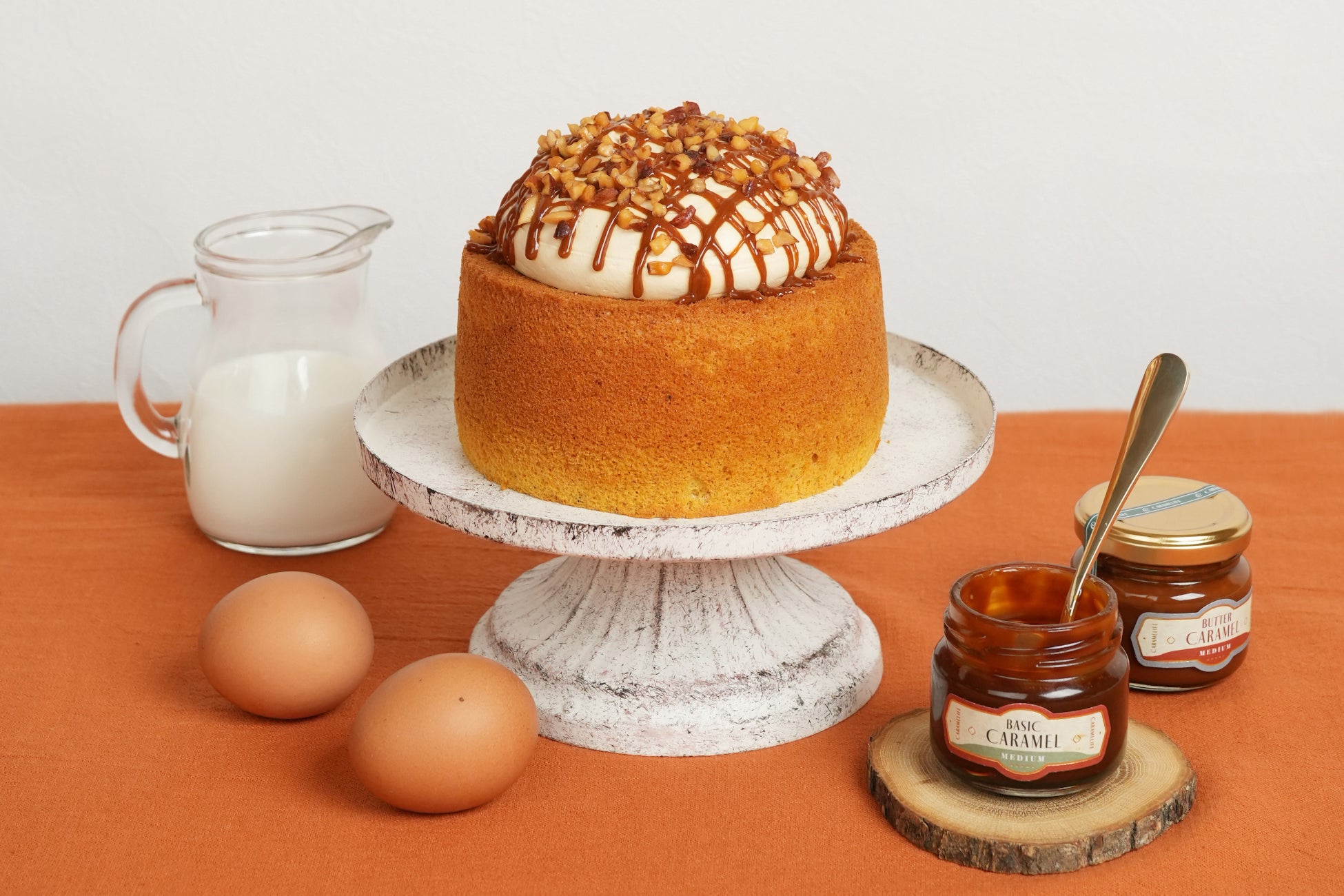 ケーキ天面には、CARAMELIFEの「BASIC MEDIUM」を使用したキャラメルソースを格子状にデコレーション。濃厚で奥深いキャラメルの風味を存分にお楽しみいただけます。