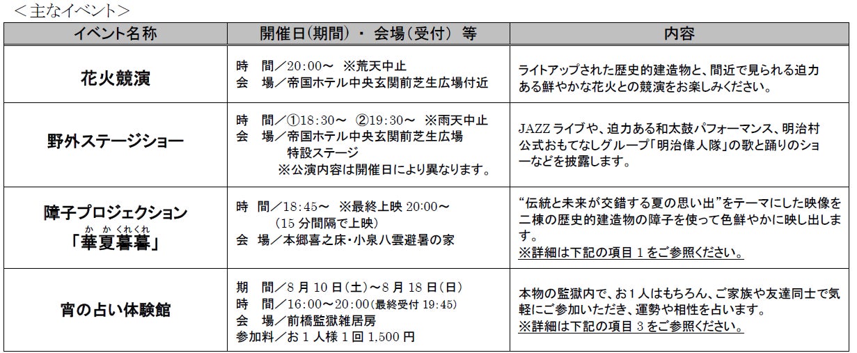 博物館 明治村(犬山市内山1番地、理事長:髙﨑 裕樹)では、夏恒例のナイター営業となる「宵の明治村」をはじめ、日本の夏を楽しめる各種イベントを開催します。「宵の明治村」では、開村時間を20時30分まで延長し、鮮やかな花火が歴史的建造物と夜空を彩る「花火競演」をはじめ、JAZZライブや迫力ある和太鼓パフォーマンスなどの大人からお子様まで楽しめる「野外ステージショー」や、“伝統と未来が交錯する夏の思い出”をテーマに、二棟の歴史的建造物の障子を用いた「障子プロジェクション『華(か)夏(か)暮(くれ)暮(くれ)』」などを開催します。「宵の明治村」開催日に浴衣を着用してご来村のお客様は入村料が半額になります。