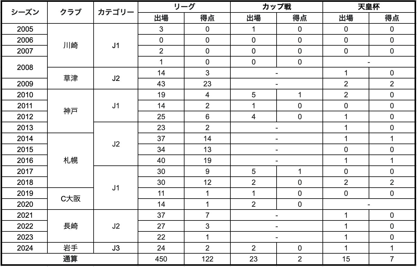 キンダー善光SC – 横浜F•マリノスJrユース菅田 – 川崎フロンターレU-18 – 川崎フロンターレ – ザスパ草津 – 川崎フロンターレ – ザスパ草津 – ヴィッセル神戸 – 北海道コンサドーレ – セレッソ大阪 – V・ファーレン長崎 – いわてグルージャ盛岡