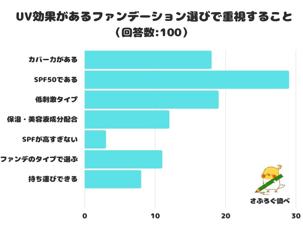 ・UV効果のあるファンデーションを買う時には、なるべくUV効果の高いSPF50を選んで日差しが強い日(紫外線が気になる日)にも対応可能なものを買いたいからです。UV対策をするに越したことがないと思うのでUVカット目的で買う物は効果が高い物を好んで選んでいます。(女性20代)