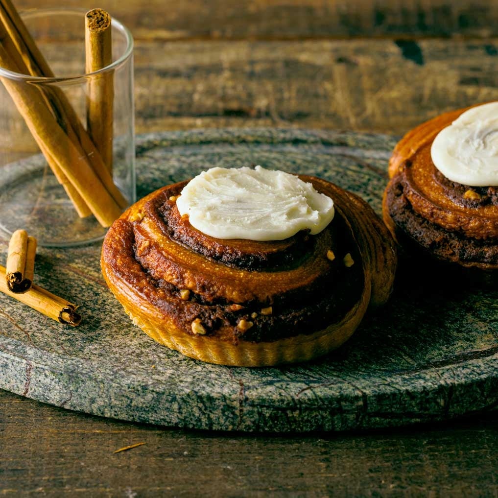 シナモン風味のしっとり生地で、シナモンのフィリングとパウダー、ダイスのアーモンドを巻き込みました。ミルキーなアイシングをトッピングした、まろやかさとスパイシーさを楽しめるシナモンロールです。