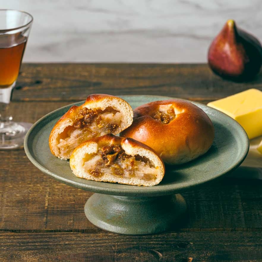 発酵バターとラム酒漬けしたいちじく入りのあんを、酒種生地で包みました。香り高くまろやかな味わいに、プチプチとした食感がいいアクセント。