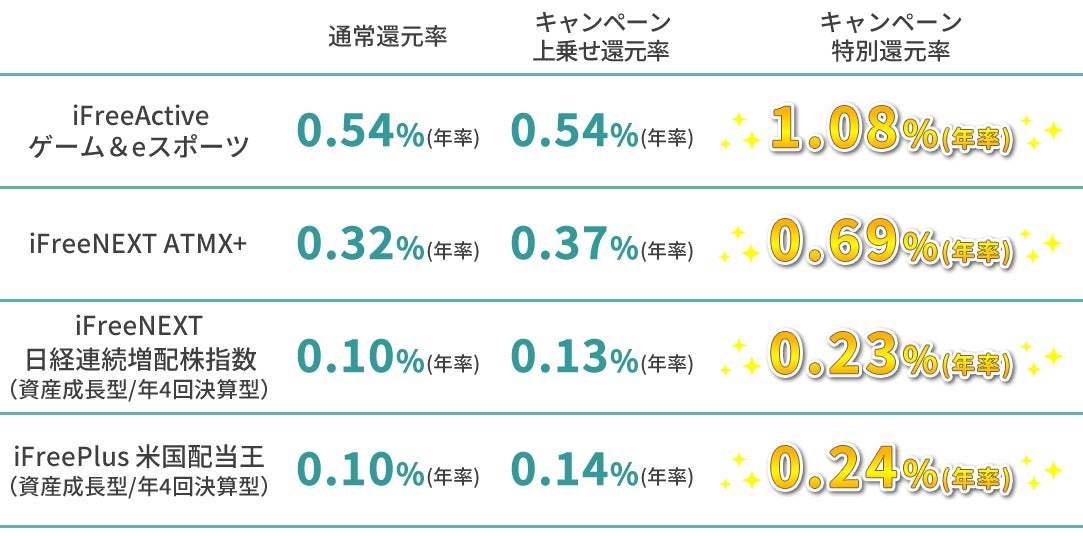 最大1%貯まる投信残高ポイントサービスの通常の還元額に加えて、残高に応じて、対象銘柄の還元率ごとに松井証券ポイントをプレゼント。 <キャンペーン上乗せ還元率> ・iFreeActive ゲーム&eスポーツ:0.54%(年率) ・iFreeNEXT ATMX+:0.37%(年率) ・iFreeNEXT日経連続増配株指数(資産成長型):0.13%(年率) ・iFreeNEXT日経連続増配株指数(年4回決算型):0.13%(年率) ・iFreePlus 米国配当王(資産成長型):0.14%(年率) ・iFreePlus 米国配当王(年4回決算型):0.14%(年率) |