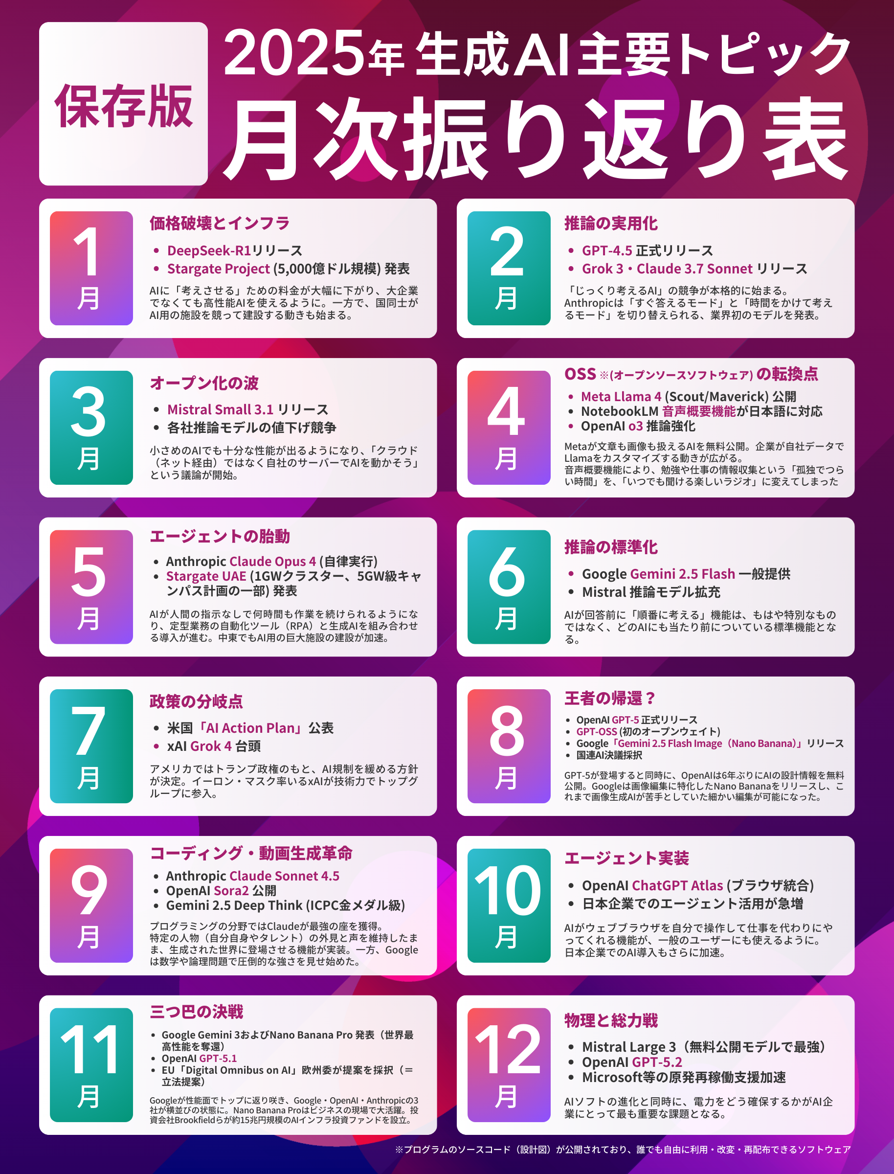 2025年、生成AIは「ただのチャットボット」を卒業。一言で言えば、「AIが自分で考え、現場で汗をかき始めた年」です。年初には中国企業による劇的な価格破壊が起き、OpenAI一強時代の終焉とともに、Gemini 3やNano Banana ProのリリースによるGoogleの躍進やDeepSeekのような無料で使えるオープンウェイトモデルの急成長が続きました。