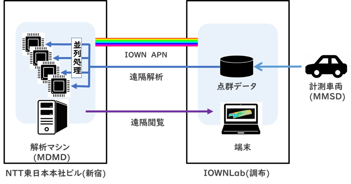 本実証では、点群データが保存されているPCを設置したNTTe-City Labo(※9)内の「IOWN Lab(※10)」(調布市)と、解析マシンを設置したNTT東日本初台本社ビル(新宿区)の拠点間を、1波長あたり100Gbpsの大容量かつ低遅延、ゆらぎゼロの特長を持つAPNで接続し、点群データの遠隔解析・遠隔閲覧の実証を行いました。