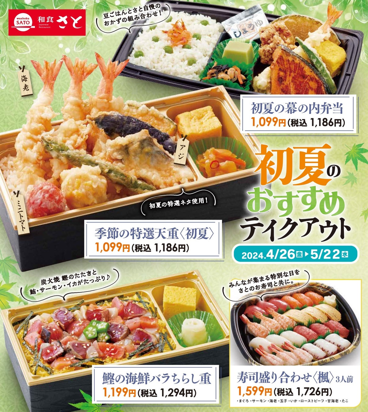 いつも和食さとをご利用頂いているお客さまも、初めてのお客さまもこの機会に初夏限定のさとのテイクアウトメニューを是非お楽しみください。