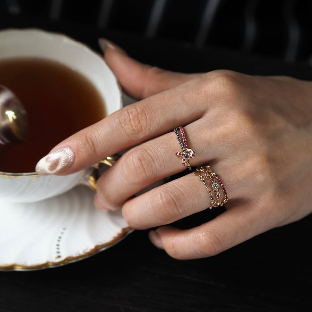 新型では、石の配置バランスを見直し、幅をわずかに絞ることで重ねづけにも映える軽やかなフォルムに仕立てました。指先に自然と馴染む華やかさを保ちながら、より洗練された印象をお楽しみいただけます。