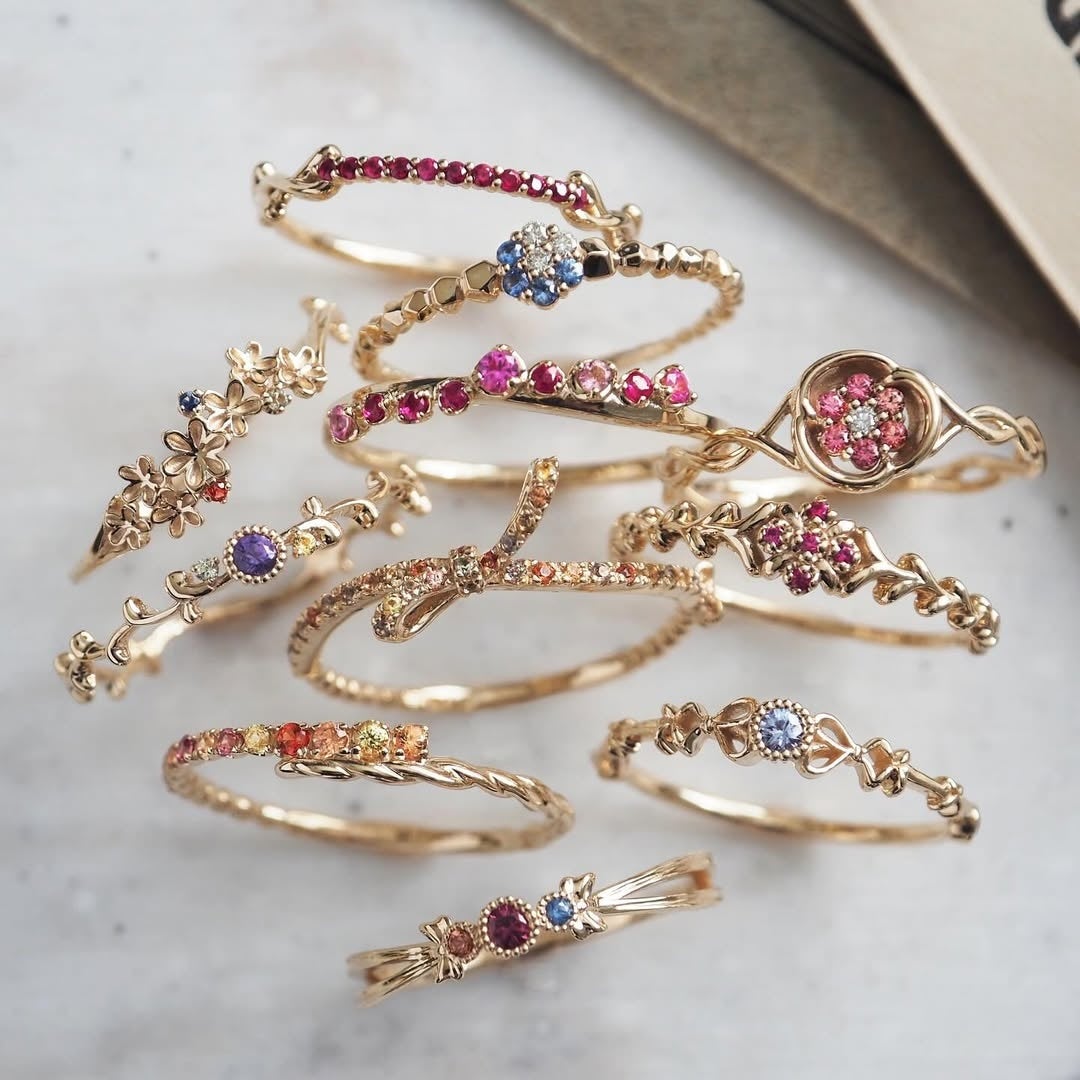 蓮や小花、リボンなど、それぞれのモチーフに合わせて、グリーンからイエロー、オレンジまでのグラデーションをつけたり、深いブルーやピンクで鮮やかにまとめたものも。サファイアやルビーの眩い輝きと、発色の良い彩りを加えることで、デザインごとの繊細さや愛らしさをより引き立てました。