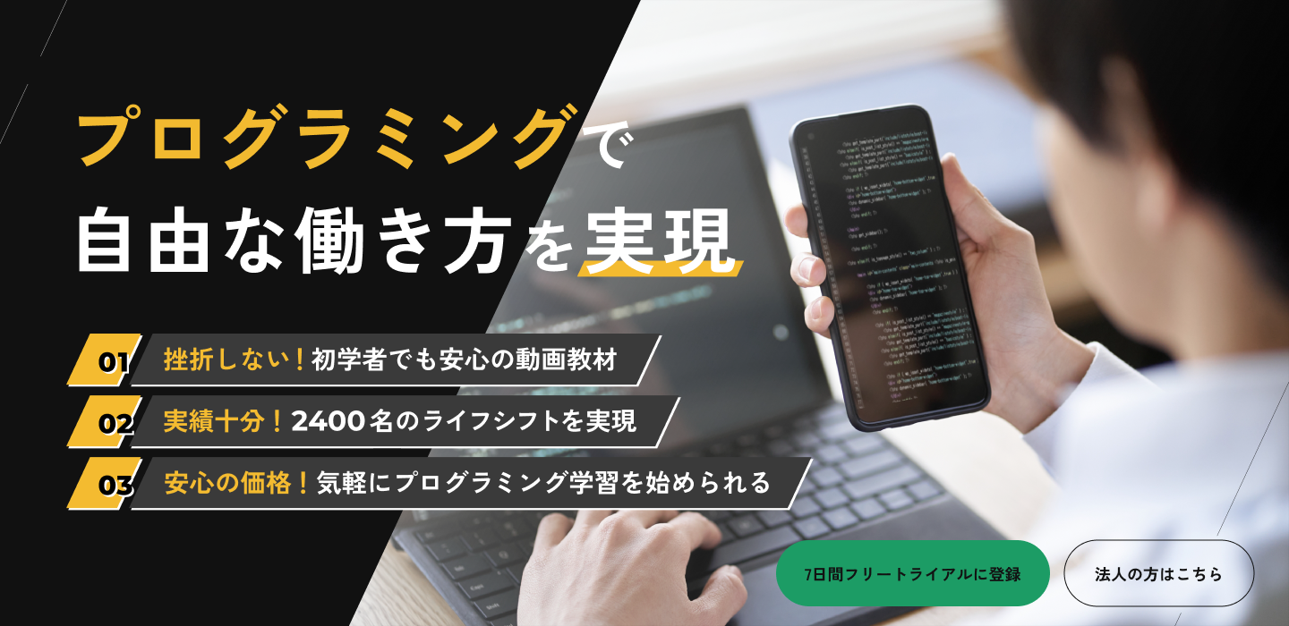 主な特徴としては、約400本の動画が学び放題・初学者が躓かない工夫を凝らした動画内容・現役エンジニアへのチャット質問が無制限・学習進捗や成果が可視化された独自の管理システムなどがあり、充実した教材と安心のサポート体制を通じて、それぞれのライフシフトを実現するきっかけを創出できればと考えております。