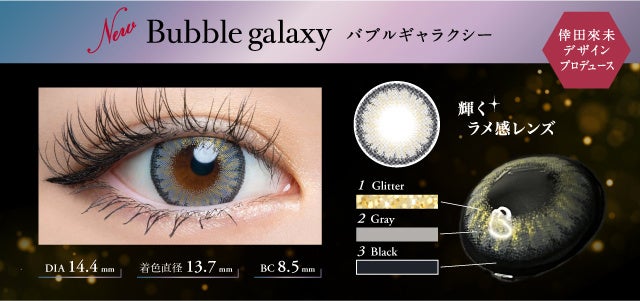 今回で7色目となる、倖田來未デザインプロデュースレンズBubble galaxy(バブルギャラクシー)は、loveilとしては初となるグリッターレンズとなっており、まばたきするたびに煌めくような存在感のあるレンズとなっております。
