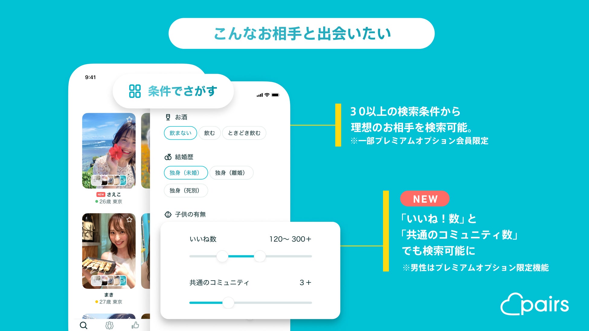 「条件でさがす」は、明確な理想のお相手像をお持ちの方や、自分から積極的にお相手を探したい方に向け、30を超える検索条件項目から理想のお相手を見つけることができるモードです。