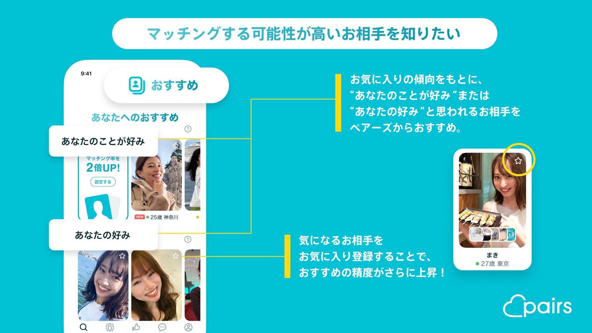 これまでのペアーズの利用履歴などを元に、 “あなたのことが好みなお相手” や、”あなたの好みのお相手” をペアーズが分析しておすすめします。自分に合うお相手がわからない方や、マッチングする可能性が高いお相手を知りたいという方におすすめのモードです。