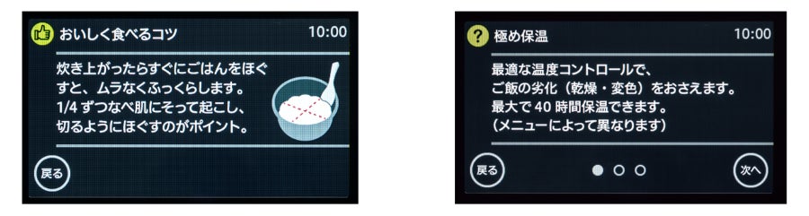 コントラストが強く、文字が見やすいカラータッチ液晶です。簡単な機能説明やおいしく食べるコツなどのお役立ち情報を確認できるアドバイス機能やヘルプ機能も搭載しているので、初めての方でもより製品を使いこなしやすくしてくれます。