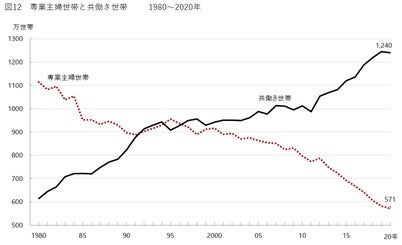 「専業主婦世帯」は、夫が非農林業雇用者で妻が非就業者(非労働力人口及び完全失業者)の世帯。2018年以降は、厚生労働省「厚生労働白書」、内閣府「男女共同参画白書」に倣い夫が非農林業雇用者で妻が非就業者(非労働力人口及び失業者)の世帯。