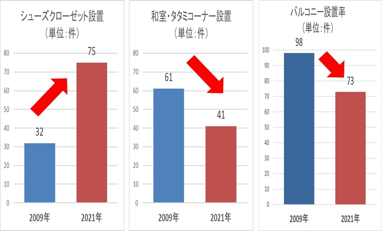 シューズクローゼットの設置が2倍超、畳の設置は減少