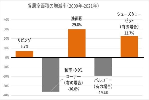 ■“家事楽”を考えた洗面所が増加、洗面所の面積が大幅に拡大、一方でバルコニーの面積は減少