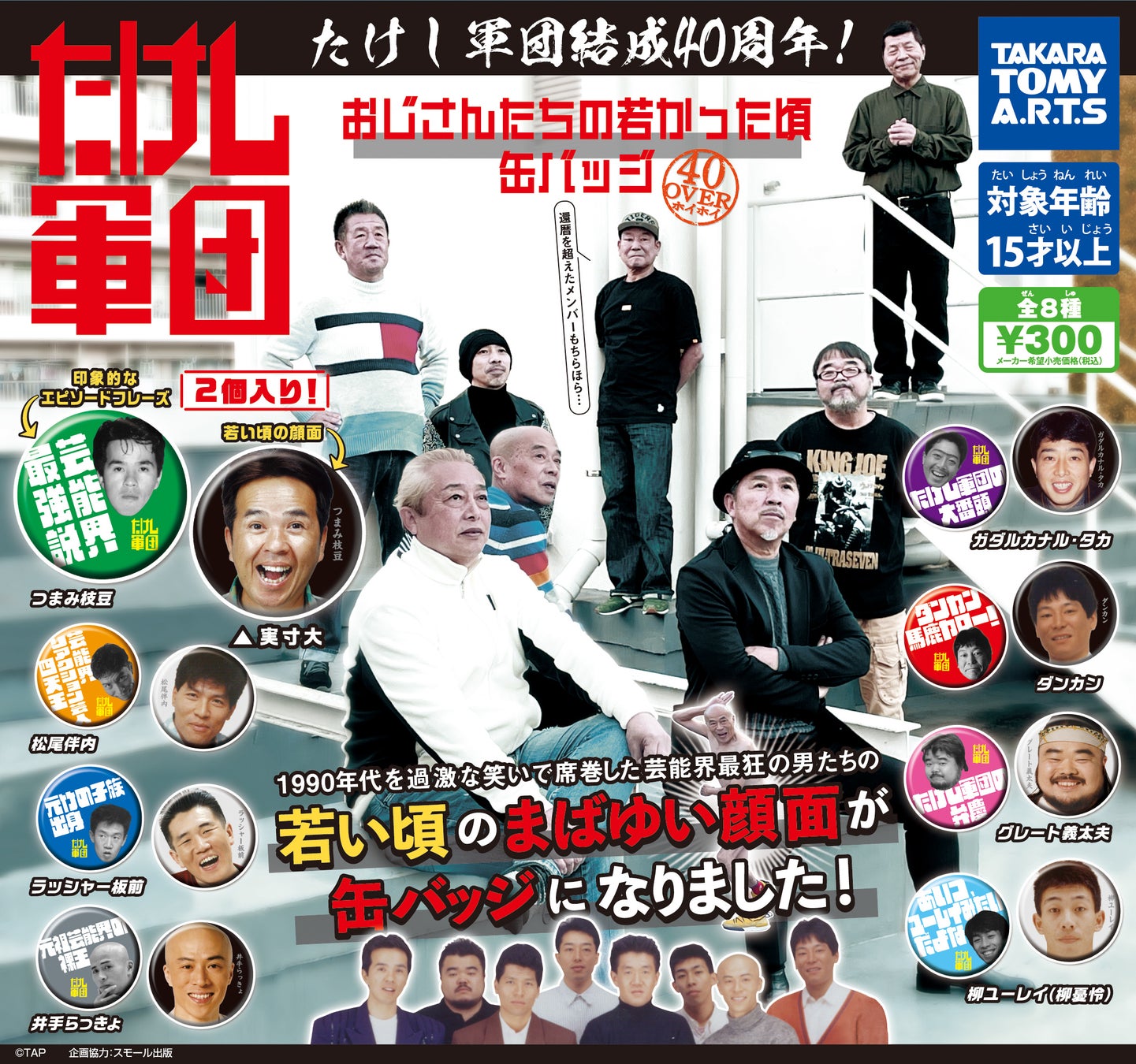 株式会社タカラトミーアーツは、今年結成40周年を迎えた「たけし軍団」とコラボレーションし、メンバーの若かりし頃の写真を使用した『たけし軍団 おじさんたちの若かった頃 缶バッジ』を2022年10月下旬から全国のカプセル自販機(ガチャ)で順次発売いたします。