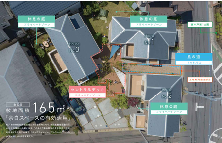 街区の中心に共有地を設ける提案が増えていますが、そのほとんどで“共有すること”が優先され、プライベート性は後回しにされています。しかし、本来であれば、住人同士の交流を促す場所、それぞれが落ち着いて過ごせる場所としての機能が共存するような街並みデザインが望ましいと考えられます。