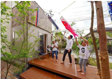 本計画では、外部空間に子どもたちが自由に遊びまわることができるコミュニティゾーン「セントラルデッキ」と、子どもも大人も一息つけるプライベートゾーン「休息の庭」を設け、住人が自由に使い分けることで、入居後も適度な距離感を保ちながら子どもを通じて交流を育んでいけるようなデザインとしました。 「セントラルデッキ」には、シンボルツリーとともにタープを取り付けられるポールを設置。ポールには、鯉のぼりを始めとする季節のイベントに因んだ装飾を取り付けることも可