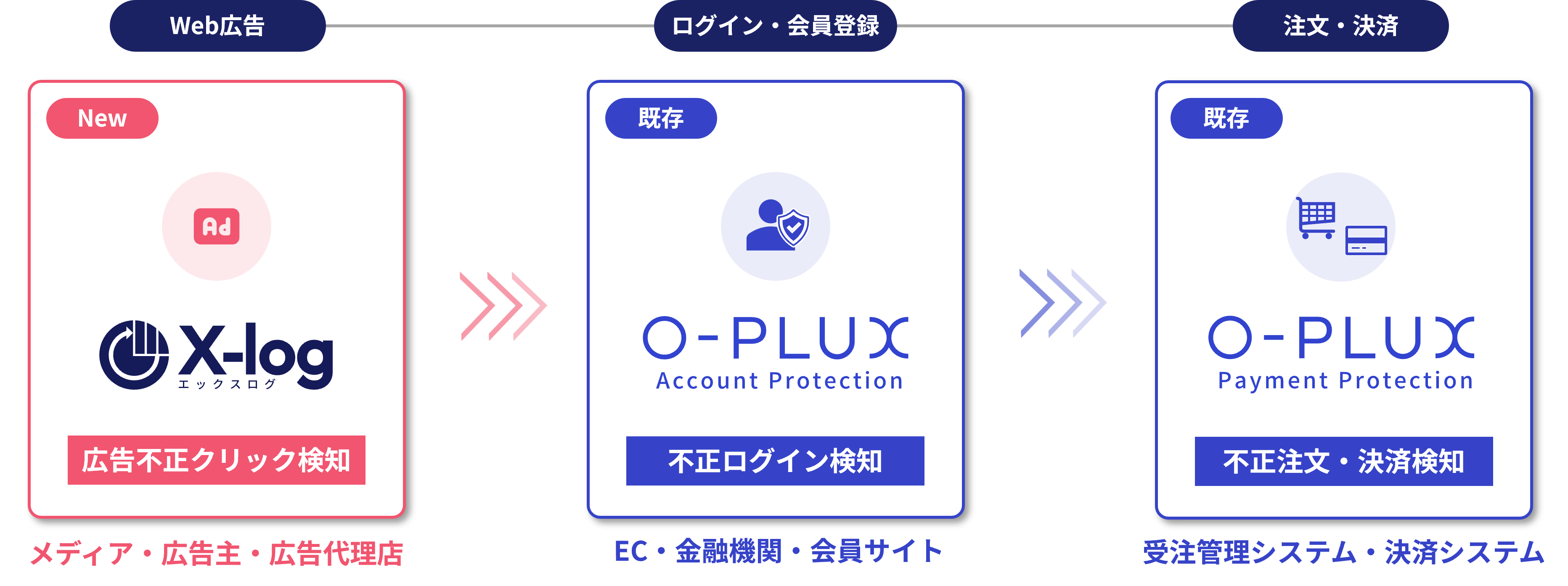 本サービスにより、広告流入段階での不正クリック(アドフラウド)による広告費の無駄を検知・削減することが可能となり、当社がこれまで提供してきた「O-PLUX(オープラックス)」と合わせ、広告集客からログイン、決済に至るまで、オンラインビジネスにおける不正対策をシームレスに提供できる体制が整いました。