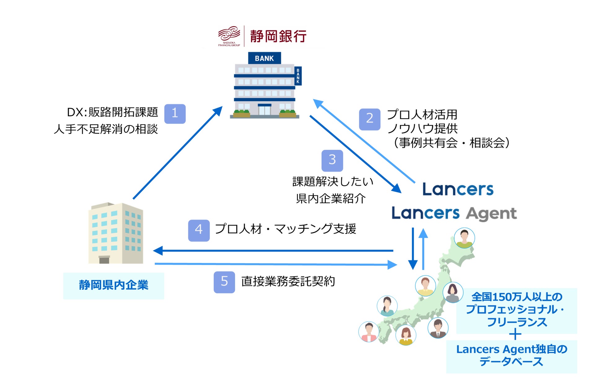 静岡銀行が支援する静岡県内企業に対し、ランサーズが各企業のニーズに合った外部人材のマッチングを支援いたします。デジタル人材を中心としたフリーランス・副業人材が登録する『Lancers』をマッチングに活用することで、IT人材の不足やDX推進といった企業の課題解決に伴走いたします。