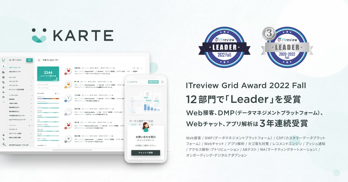 株式会社プレイド(東京都中央区:代表取締役CEO 倉橋健太)の提供するCXプラットフォーム「KARTE」が、アイティクラウド株式会社(東京都港区:代表取締役社長 黒野源太)運営のIT製品レビュープラットフォーム「ITreview(アイティレビュー)」において満足度・認知度ともに優れた製品であると評価され、前期に引き続き「ITreview Grid Award 2022 Fall」の12部門にて「Leader」を受賞しました。