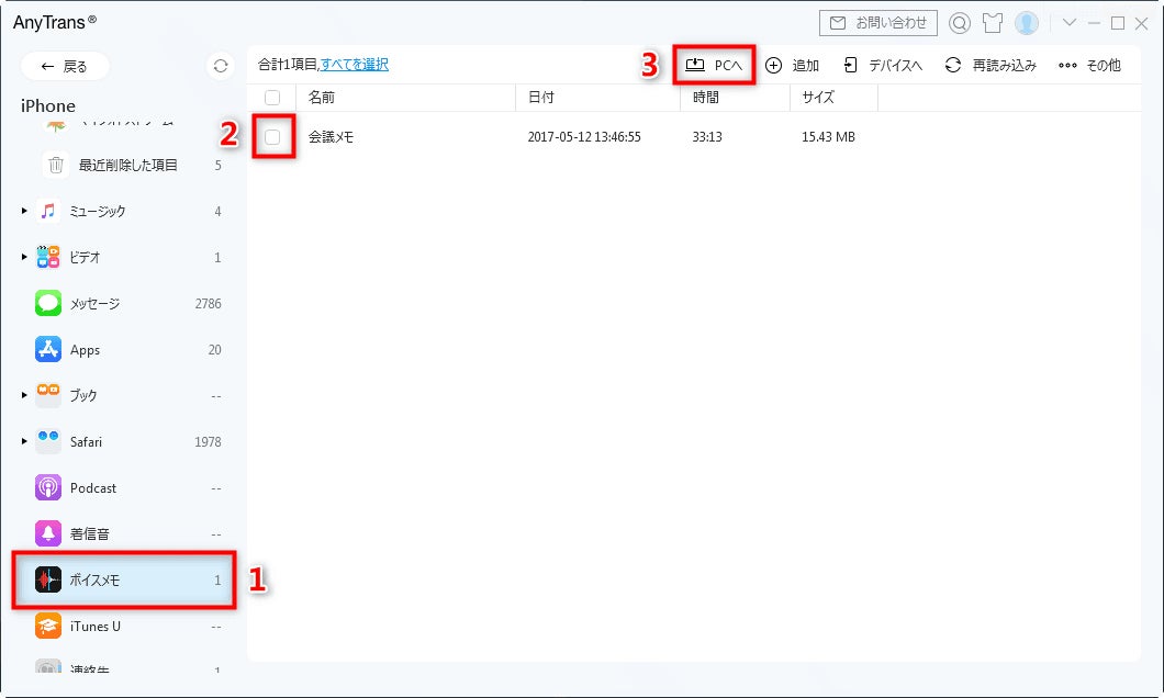Step 2: 「ボイスメモ」を探してクリック > バックアップしたいボイスメモを選択 > 右上の「PCへ」ボタンをクリックしてiPhoneのボイスメモをパソコンに転送してバックアップします。