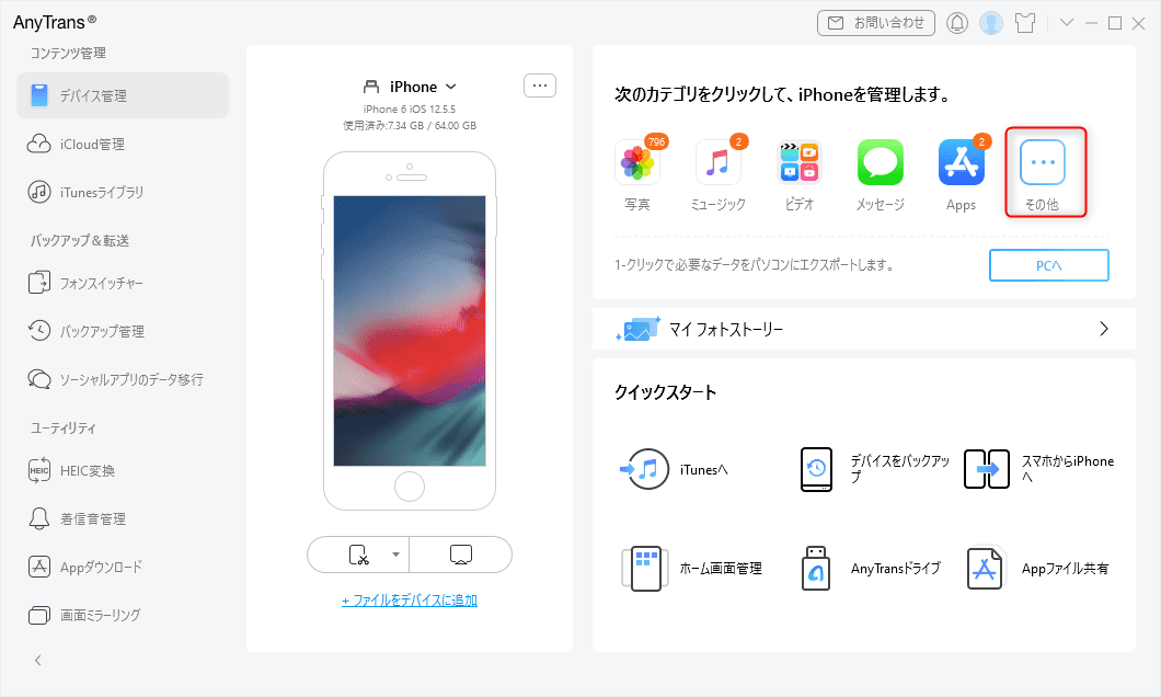 Step 1: iPhoneをUSBケーブルでパソコンと接続 > 「その他」をクリックしてカテゴリで管理の画面に入ります。
