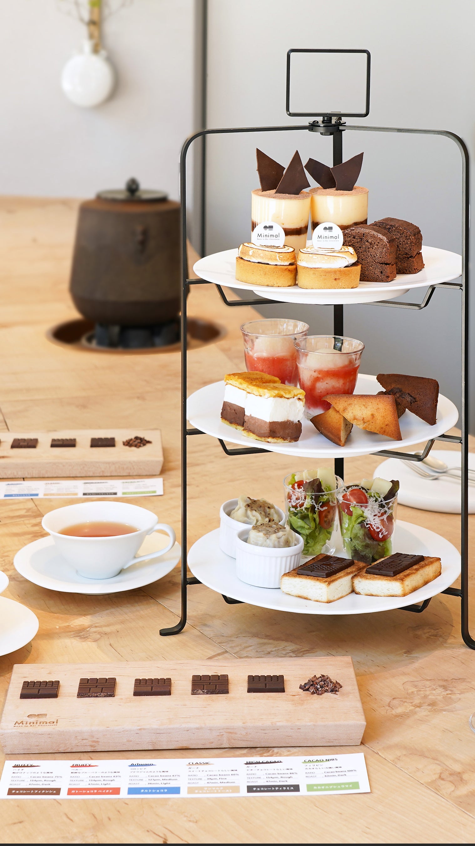 カカオ・チョコレートの魅力をぎゅっとまとめた、Minimalならではのアフタヌーンティーができました。10種のスイーツとセイボリーには、全てカカオ・チョコレートを使用しながら、驚くほど多彩な味わいを表現しています。