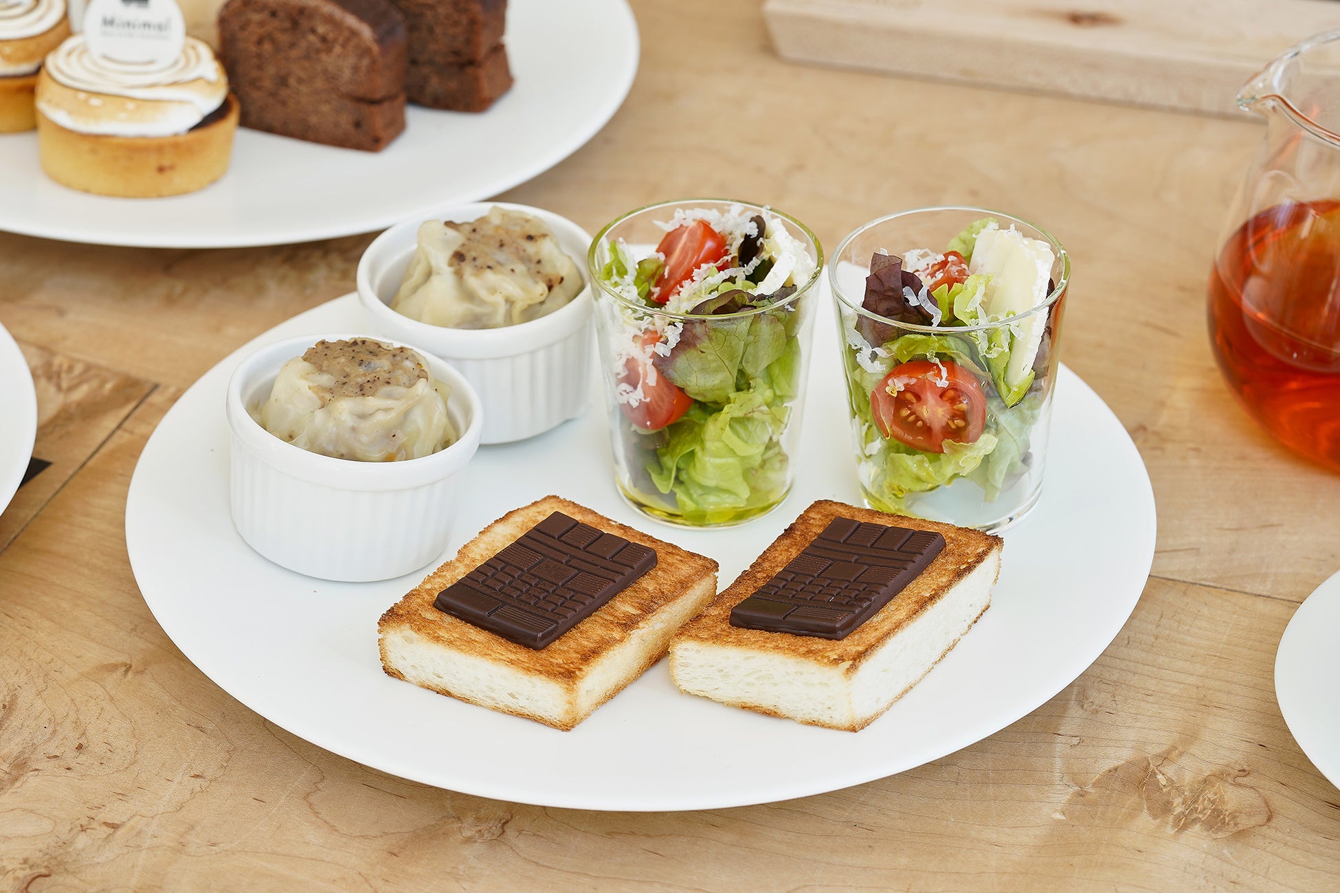 セイボリーには、清澄白河でモダンな中華を提供する人気店「O2(オーツー)」が開発したカカオニブシュウマイや、渋谷区・富ヶ谷のクラフトブランド「CHEESE STAND」のリコッタサラータとカカオニブを使ったサラダなど、個性溢れる品々をご用意しています。