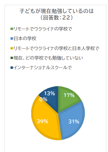 ● 現在約70%の子どもが日本の公立学校で学んでいる。前回の調査と比較すると、この数字は17%増加している。これは、ウクライナ紛争が長期化し、子どもが日本社会に順応することが必要になってきたことが影響しているのか、あるいは将来設計が変わったことが推測される。また、ウクライナの学校だけで勉強している子どもは2割弱(たまにしかウクライナの学校で勉強していないという回答もあった)で、4割近くの子どもは両方の学校で勉強を続けており、精神的、肉体的な負担が大きいことが分かる。日本の学校に通っていない子どももいる。ウクライナの紛争が長引く中、子どもの健全な成長のためには社会性が必要であるため、日本の学校に通えない子どもがいる理由を探ることは非常に重要である。