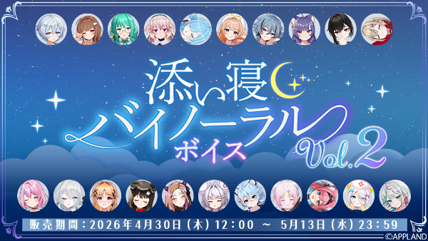 株式会社アップランド(本社:東京都世田谷区)は、「.LIVE」・「ぶいぱい」メンバー6名の『パジャマグッズ2026』および総勢21名が参加する『添い寝バイノーラルボイスVol.2』をAPPLAND OFFICIAL SHOPにて販売することをお知らせします。